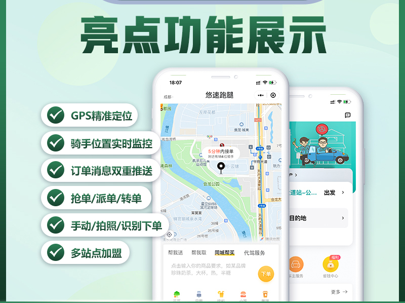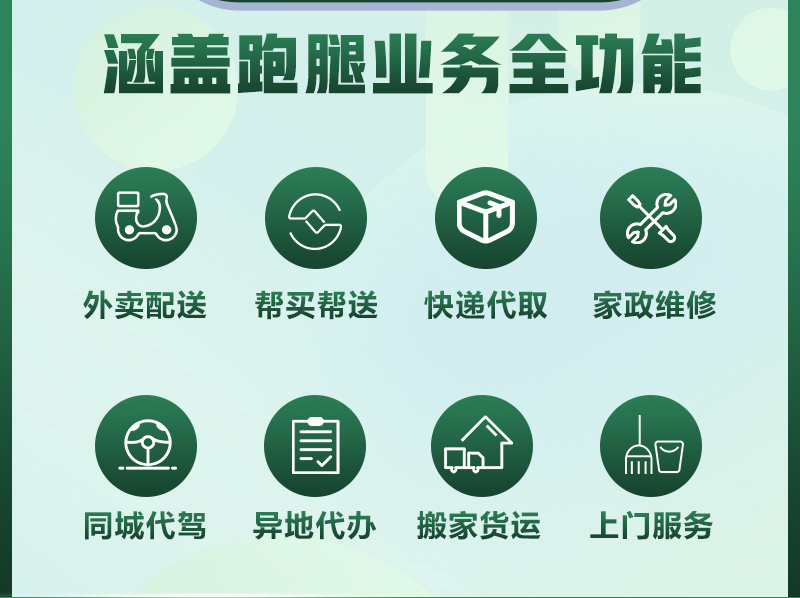 功能包含: 帮买、帮送、快递代取、礼物代送、外卖配送、代驾服务、货运搬家、上门维修、家政清洁、生鲜配送、骑手招募、骑手认证、派单/转单、接单、下单(手动下单/拍照下单/粘贴识别)等