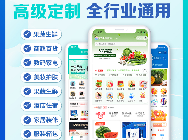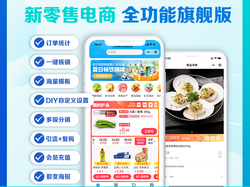 功能包含:拼团、砍价、秒杀、多级分销、满减优惠、群接龙、直播带货、团长入驻、团长招募、商家入驻、供应商入驻、区域代理、商城DIY配置、一键核销等众多功能,适用于各行各业。