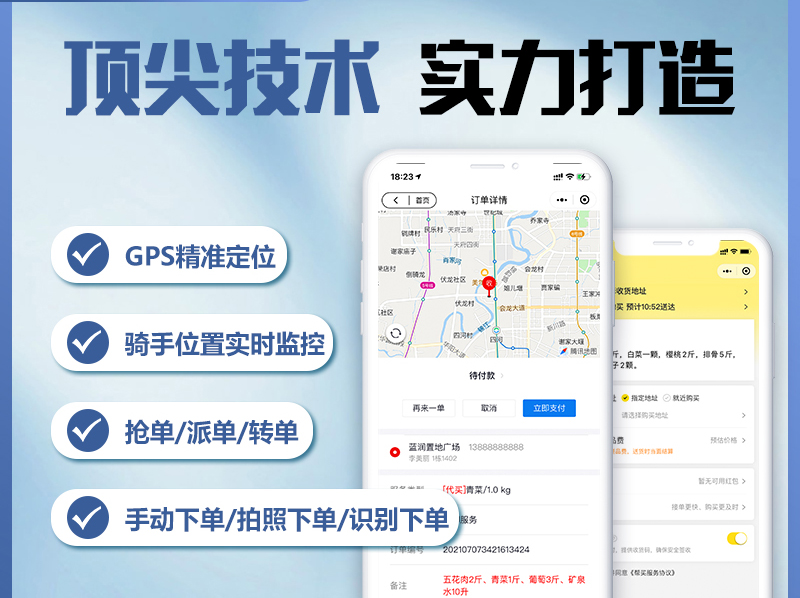 功能包含: 帮买、帮送、快递代取、礼物代送、外卖配送、代驾服务、货运搬家、上门维修、家政清洁、生鲜配送、骑手招募、骑手认证、派单/转单、接单、下单(手动下单/拍照下单/粘贴识别)等