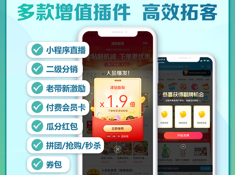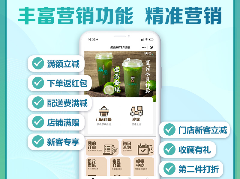 功能包含:扫码点餐、外卖配送、堂食、餐位预定、排队叫号、自动接单、订单打印、二级分销、小程序直播、会员营销、营销插件、多门店管理、进销存管理、收银管理,支持商家配送、自提+配送、对接第三方配送(达达/UU/蜂鸟)