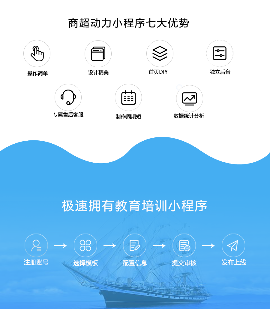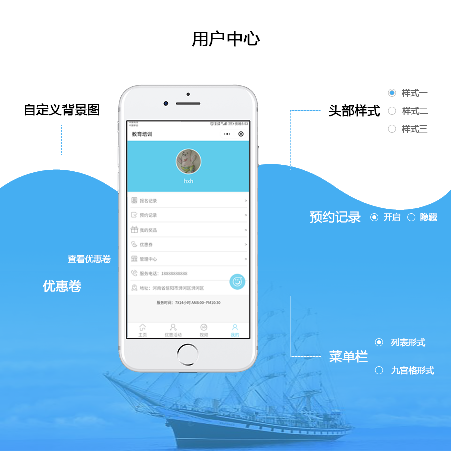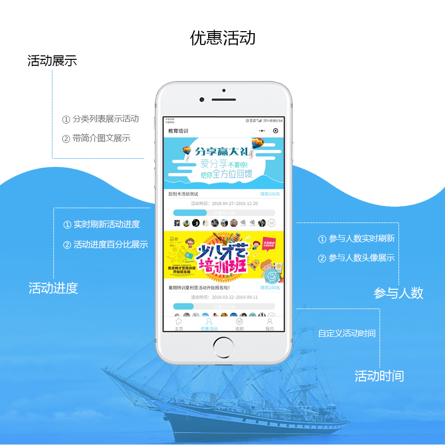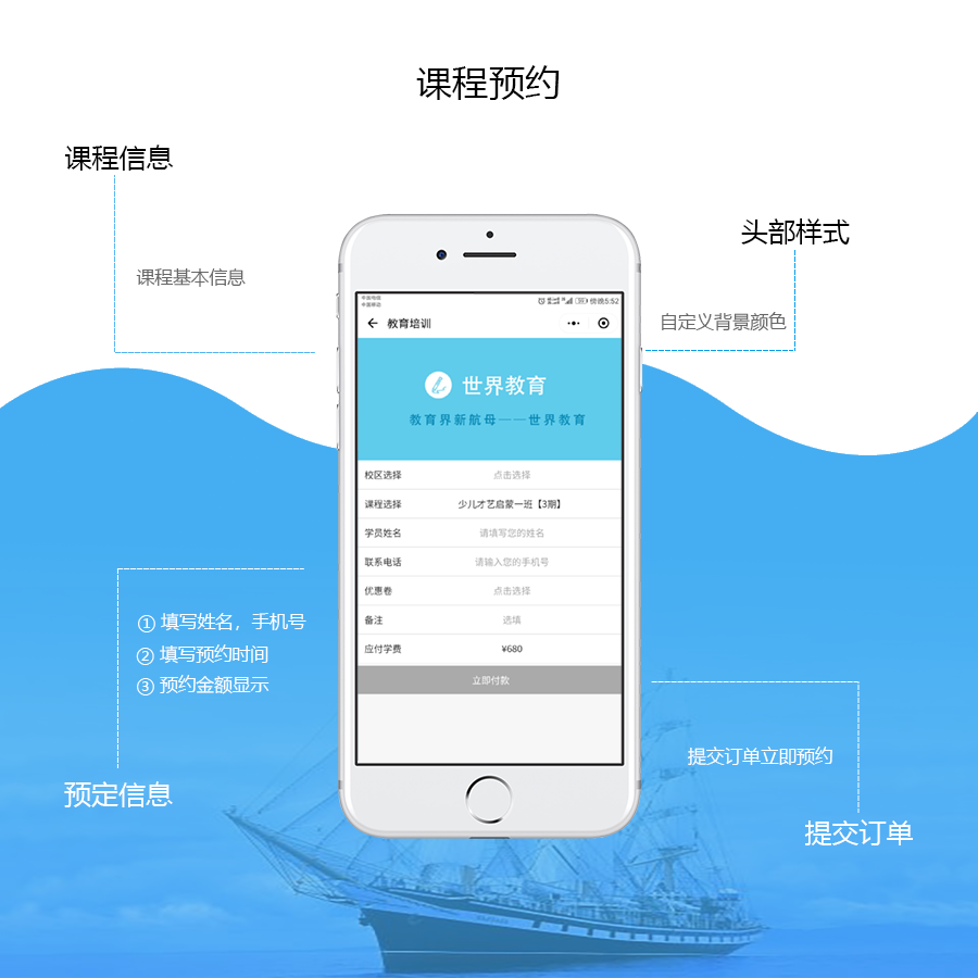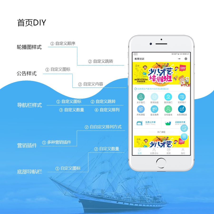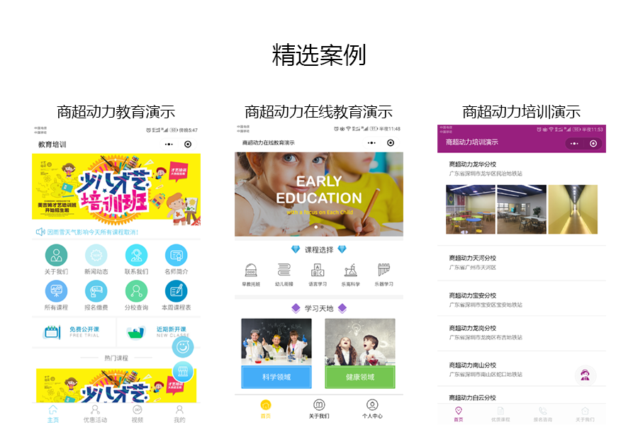 教育培训小程序功能:集卡优惠、预约试听、连锁门店、报名缴费、拓客分销、开屏广告、新闻动态、收费视频、课程点评、商家手机预约管理、手机管理功能、上课点名等多功能持续开发