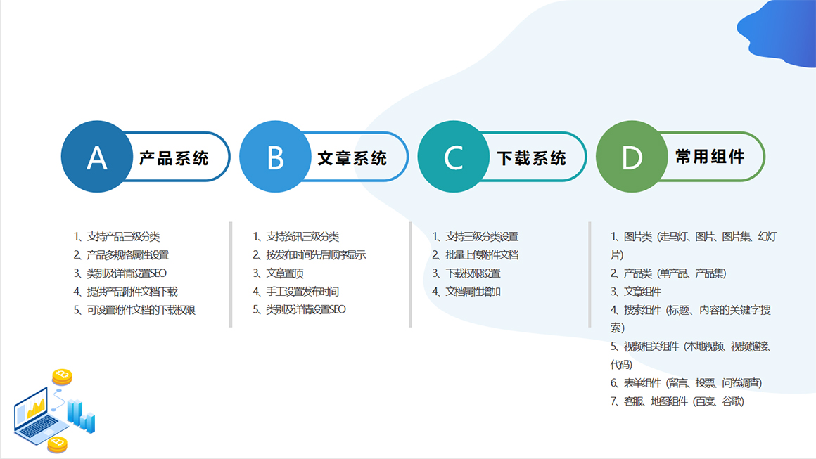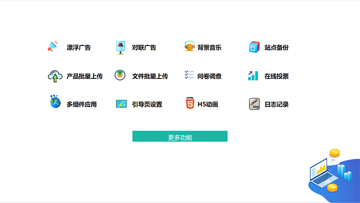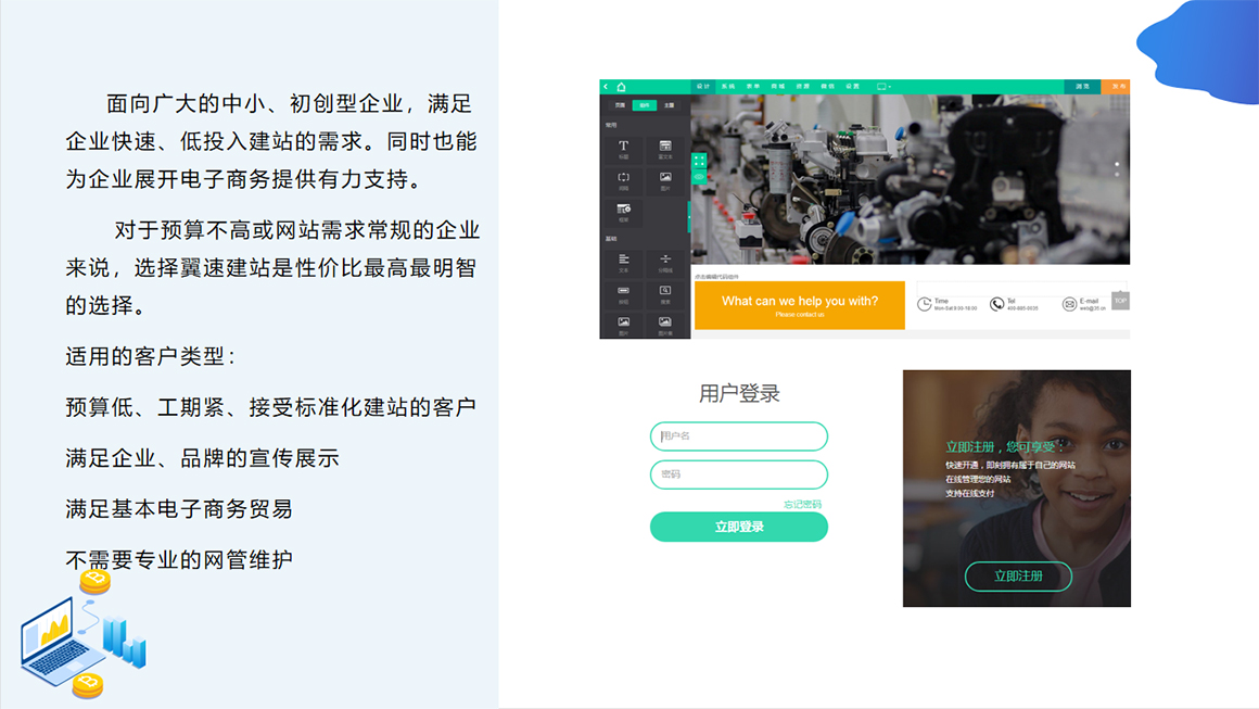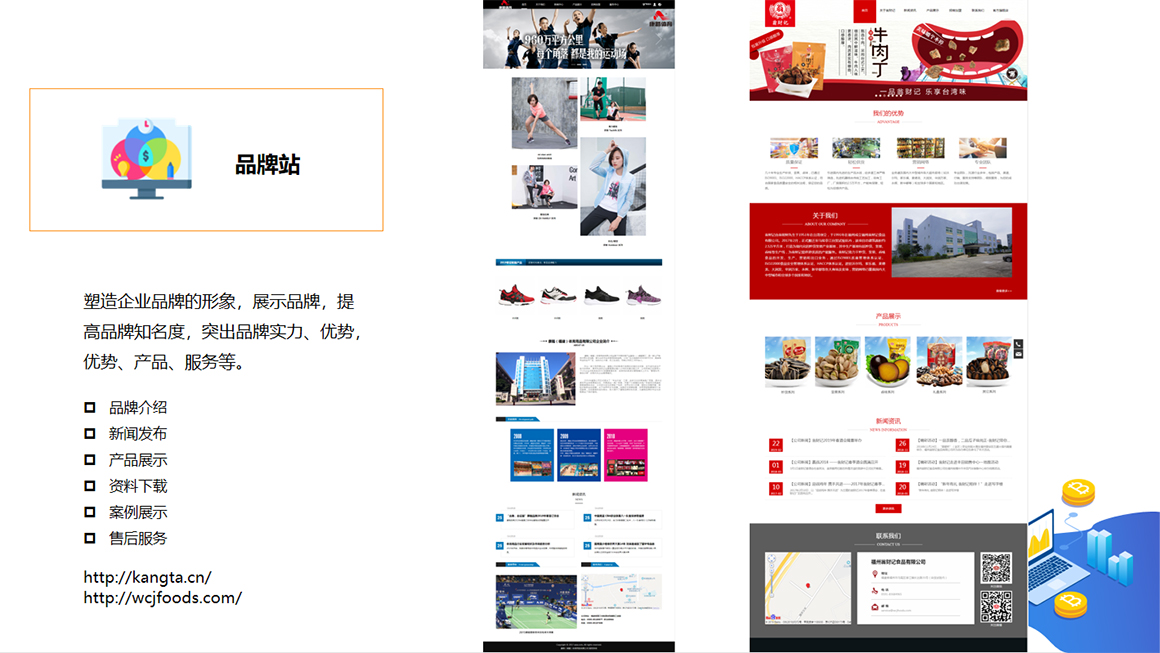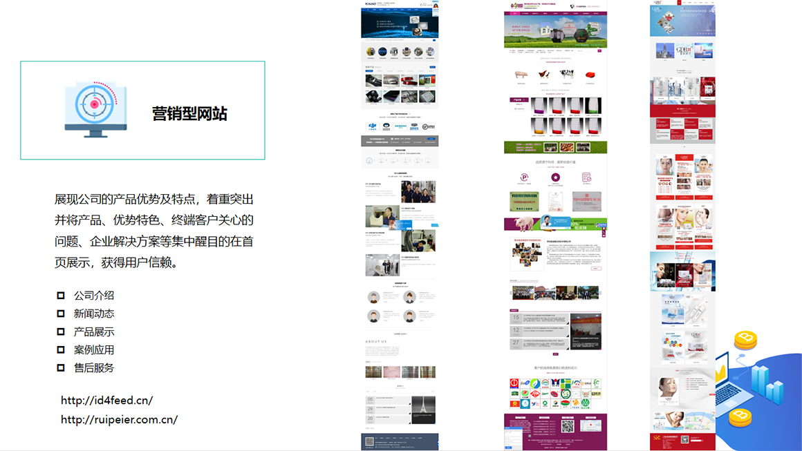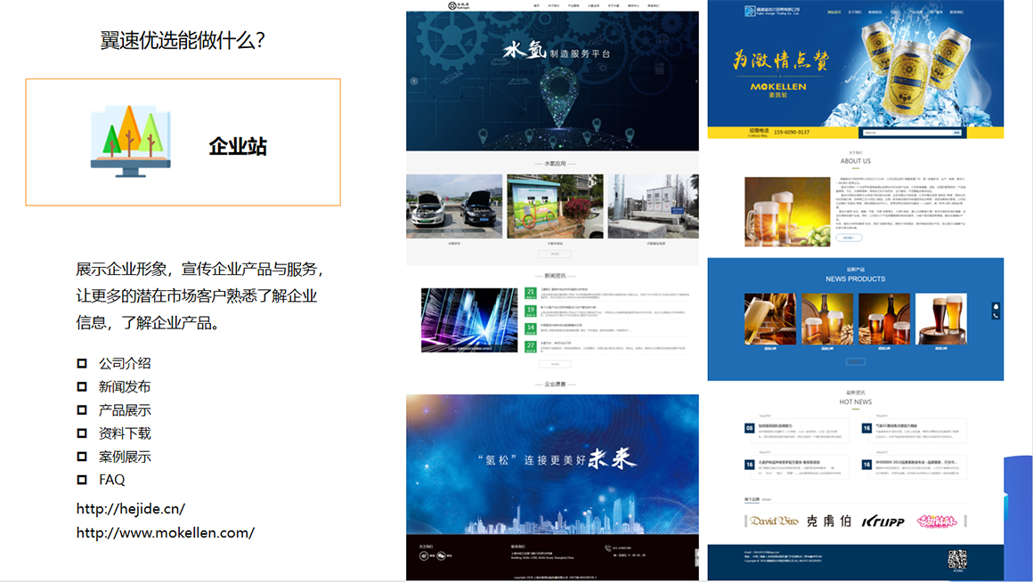 1、 网站建设——企业官网;线上商城;电脑版手机版网站;自适应响应式网站;营销型网站;3000+套模板网站;定制设计网站。